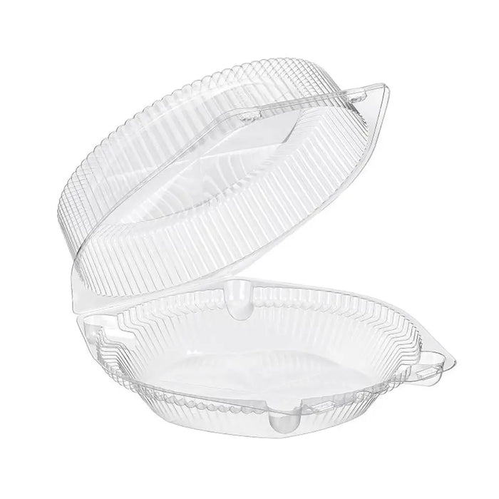 Showcase your pies with style and security using this 9" plastic clamshell pie container. Perfectly suited for restaurants and bakeries, this container is ideal for displaying and selling your delicious baked goods. Made from 100% recyclable plastic, it's durable enough to be reused. Designed to stack up to 3 high, depending on the pie's weight, this container ensures your pies stay fresh and intact. The clear plastic lid folds over and snaps securely in place, making it perfect for both storage and transport.